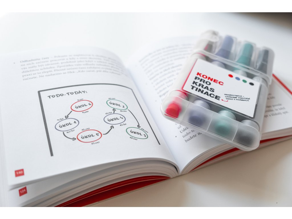 Fixy Konec prokrastinace odpovídají paletě barev, se kterými se pracuje v knize Konec prokrastinace.
